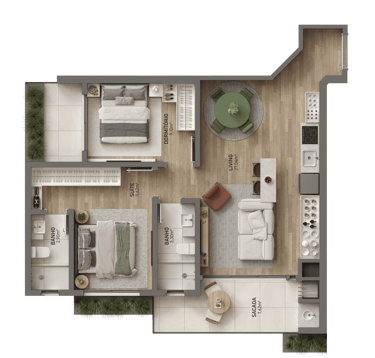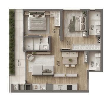 🟢Suíte + 01 quarto de 67m²